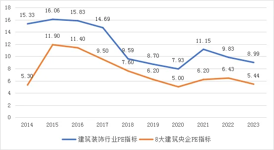 十年来,中国建筑、中国中铁等八家上市建筑装饰行业央企的总市值总和整体上呈下降趋势。