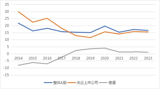 从相对市值角度来看,2018年以来央企上市公司市盈率始终低于A股市场平均市盈率,但其ROE表现却优于A股整体水平,这反映了市场对央企整体估值长期处于偏低状态。