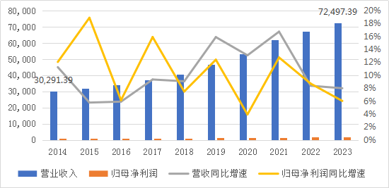 图5:八大建筑央企近十年营业总收入(单位:亿元;%)