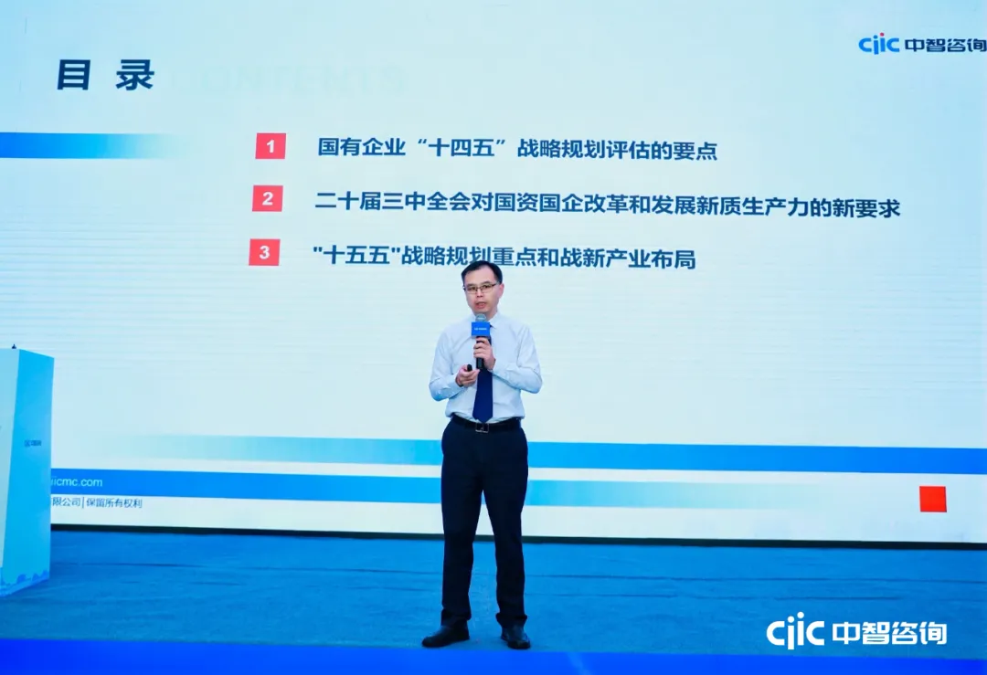 中智咨询党委委员、副总经理、高级合伙人陈和午博士在《聚焦战新产业布局和发展新质生产力,高质量谋划“十五五”战略规划》主题分享中,就国有企业“十四五”规划战略评估的四个维度、二十届三中全会对国资国企改革和发展新质生产力的新要求以及“十五五”战略规划的重点和战新产业布局进行展开分享。