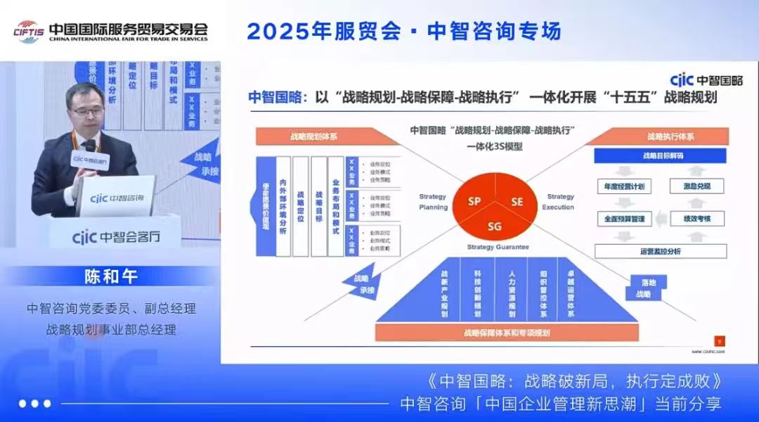 中智国略是中智咨询旗下的战略规划品牌,陈和午博士结合“十五五”发展新格局和战略规划要求作主题分享。他指出:“十五五”与“十四五”在很多方面正在发生极大变化,具有鲜明的时代特征,企业必须与国家产业升级同频共振,战略的核心不仅在于科学规划,更在于将宏观蓝图转化为可执行的行动路径,切实破解“执行难”瓶颈。此次大会上,中智国略创新推出“战略规划-战略保障-战略执行”(3S)一体化模型,助力企业精准把握“十五五”时代机遇、锚定新发展坐标。该体系融合动态管理机制,实现了从顶层设计到战略解码和资源适配的全链路穿透,已成功推动多家央国企在新质生产力发展、传统产业转型升级、战新产业布局、商业模式优化、国际化拓展与科技创新等关键领域取得重大突破。