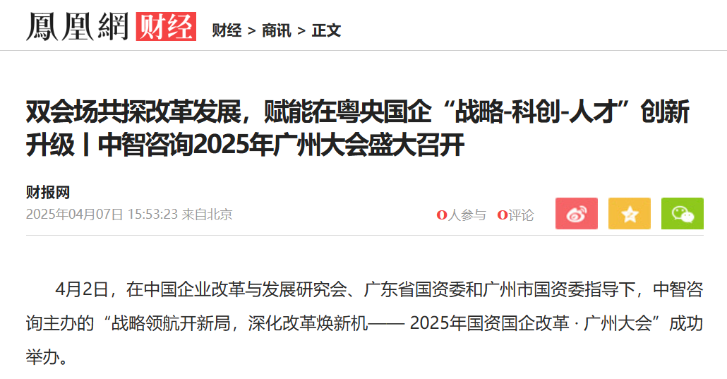 4月2日,在中国企业改革与发展研究会、广东省国资委和广州市国资委指导下,中智咨询主办的“战略领航开新局,深化改革焕新机—— 2025年国资国企改革 · 广州大会”成功举办。