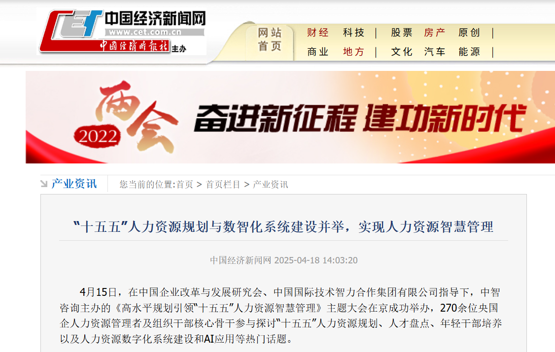 4月15日,在中国企业改革与发展研究会、中国国际技术智力合作集团有限公司指导下,中智咨询主办的《高水平规划引领“十五五”人力资源智慧管理》主题大会在京成功举办,270余位央国企人力资源管理者及组织干部核心骨干参与探讨“十五五”人力资源规划、人才盘点、年轻干部培养以及人力资源数字化系统建设和AI应用等热门话题。