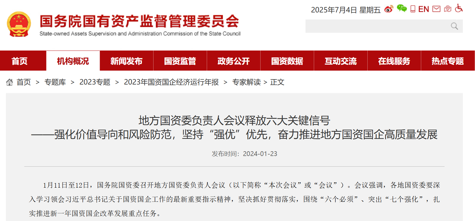 1月11日至12日,国务院国资委召开地方国资委负责人会议(以下简称“本次会议”或“会议”)。会议强调,各地国资委要深入学习领会习近平总书记关于国资国企工作的最新重要指示精神,坚决抓好贯彻落实,围绕“六个必须”、突出“七个强化”,扎实推进新一年国资国企改革发展重点任务。