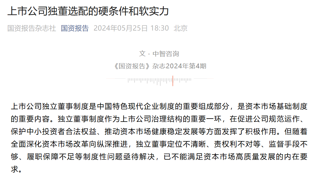 2023年国务院办公厅发布的《关于上市公司独立董事制度改革的意见》(下称《意见》)厘清了独立董事的职责定位,《意见》指出:“独立董事作为上市公司董事会成员,对上市公司及全体股东负有忠实义务、勤勉义务,在董事会中发挥参与决策、监督制衡、专业咨询作用。”
