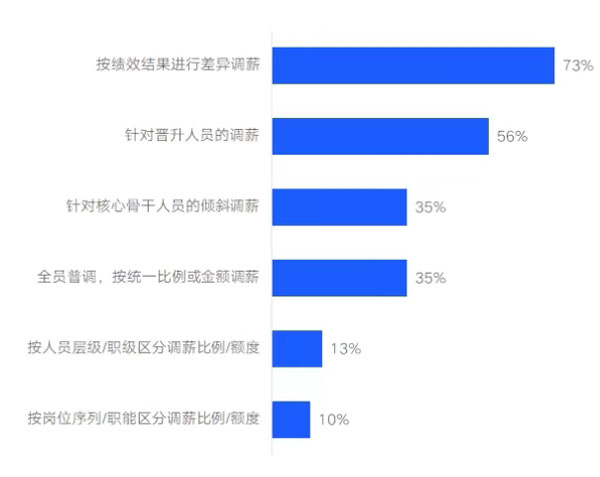 近年来企业差异化调薪的趋势愈加明显,2024年有调薪计划的企业中,超七成按绩效结果调薪,针对晋升人员调薪,以及倾斜核心/骨干人员调薪也是常见的方式。晋升人员、核心/绩优人员调薪率超过10%,是人员普调率的2倍多。