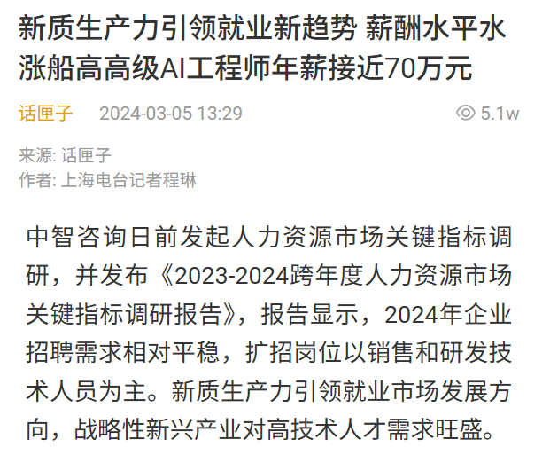 随着新兴领域高技术人才需求的增加,企业对于这类人才的争夺尤为激烈,其薪酬水平也水涨船高。调研显示,高级AI工程师年薪中位值接近70万元,数字化营销经理近40万元,智能制造工程师近30万元,薪资水平可达传统研发或专业岗位薪资的1.5-2倍。在薪酬涨幅整体放缓的背景下,热门紧缺岗位的薪资涨幅仍达10%以上。在这样的背景下,企业可以通过体系化的人才招募和培养,持续推动自身的技术创新和业务升级,以便更好地适应新质生产力的发展要求。同时,求职者也应当抓住新质生产力所带来的机遇,积极提升自身的专业能力和技术水平,满足新领域企业对于专业人才的要求。