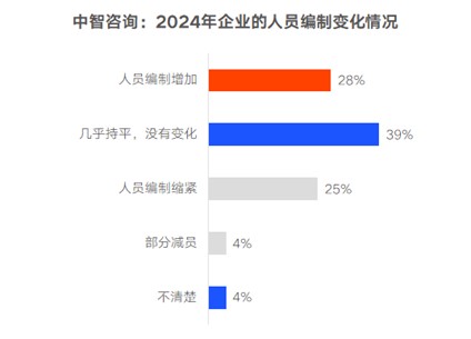2024年,大部分企业在员工编制方面保持稳定,近四成企业表示今年的人员编制和去年基本持平,28%的企业人员编制增加,同时近三成企业的编制缩紧或部分减员。人员编制变化的企业,增减比例大多在5%以内。