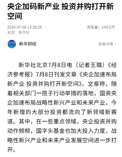 新华社北京7月8日电(记者王璐)《经济参考报》7月8日刊发文章《央企加速布局新产业 投资并购打开新空间》。文章称,随着相关部门一揽子行动举措的落地,国资央企加速布局战略性新兴产业和未来产业,今年新增的大部分投资都流向了新领域新赛道。其中,在一些重点领域,央企投资并购动作频频,国字头基金也加大投入力度,战略性新兴产业和未来产业发展空间进一步打开。