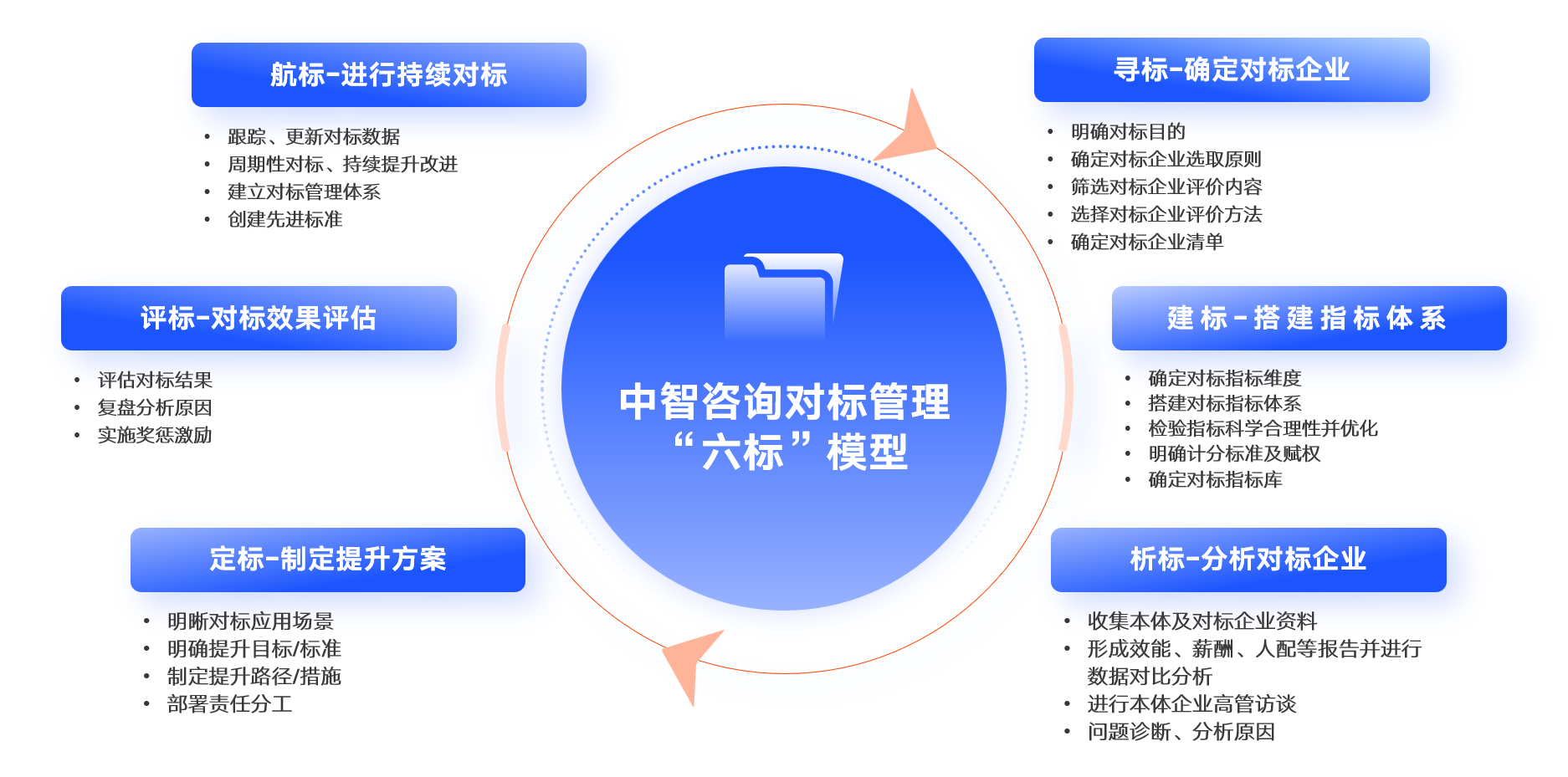 中智咨询对标管理“六标”模型是基于对标管理理论基础,结合管理学工具,并运用相关统计学方法,指导对标管理项目全流程运作的理论模型。