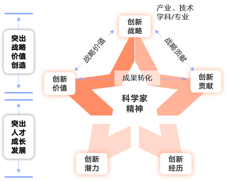 根据科技人才发展规律,建立了以创新战略、创新价值、创新贡献、创新潜力、创新经历为核心的科技人才“五星”评价模型,为企业科技人才引进培养、考核激励、选拔任用等方面提供全方位的精准导航。