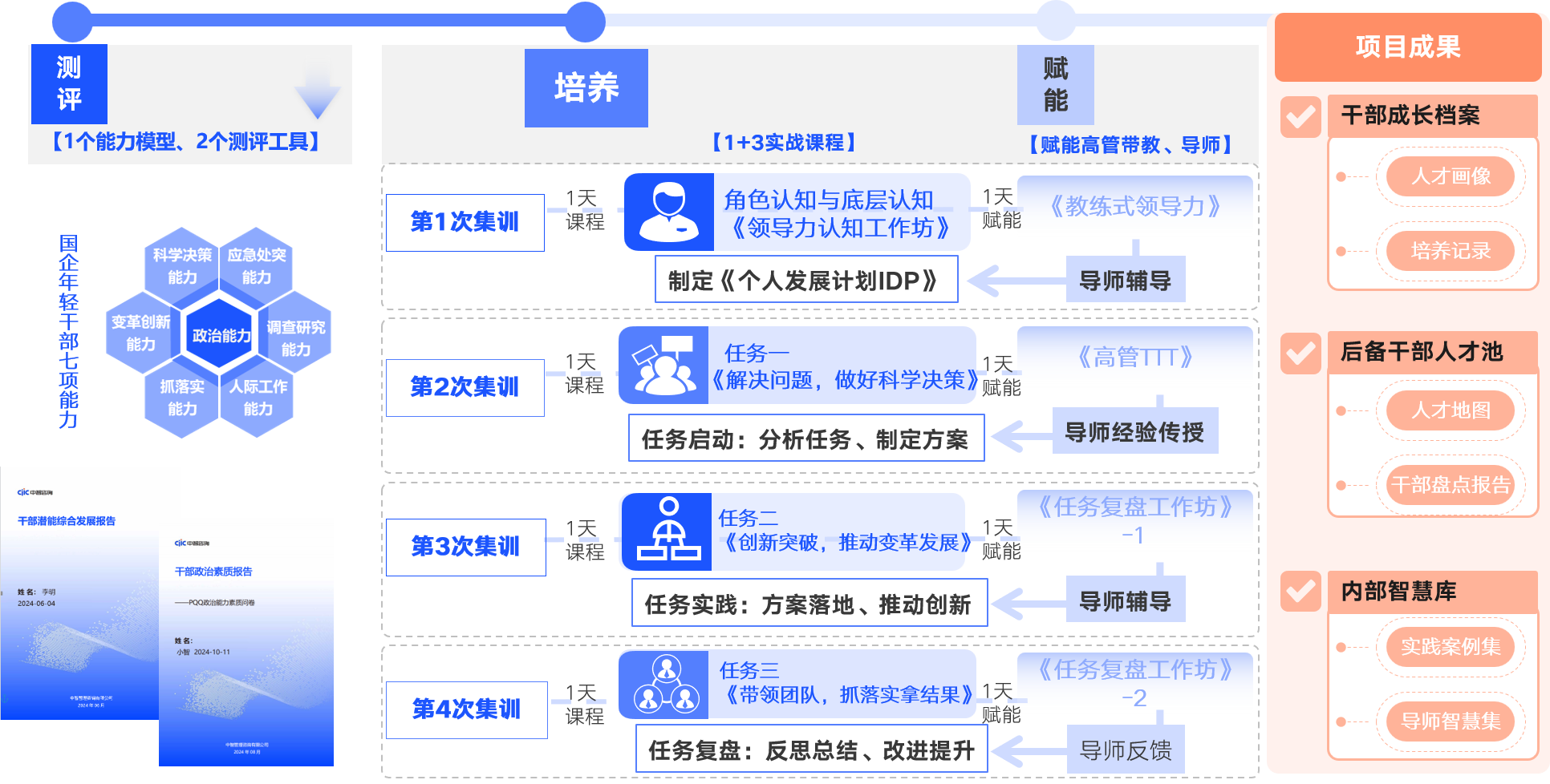 以“国企年轻干部七项能力”为基础建立测评标准,运用PQQ政治素质测评、PVQ潜能测评工具,对年轻干部的政治素养和潜在能力进行全面测评,以此为依据,更精准地了解干部特点,为后续培养提供方向。