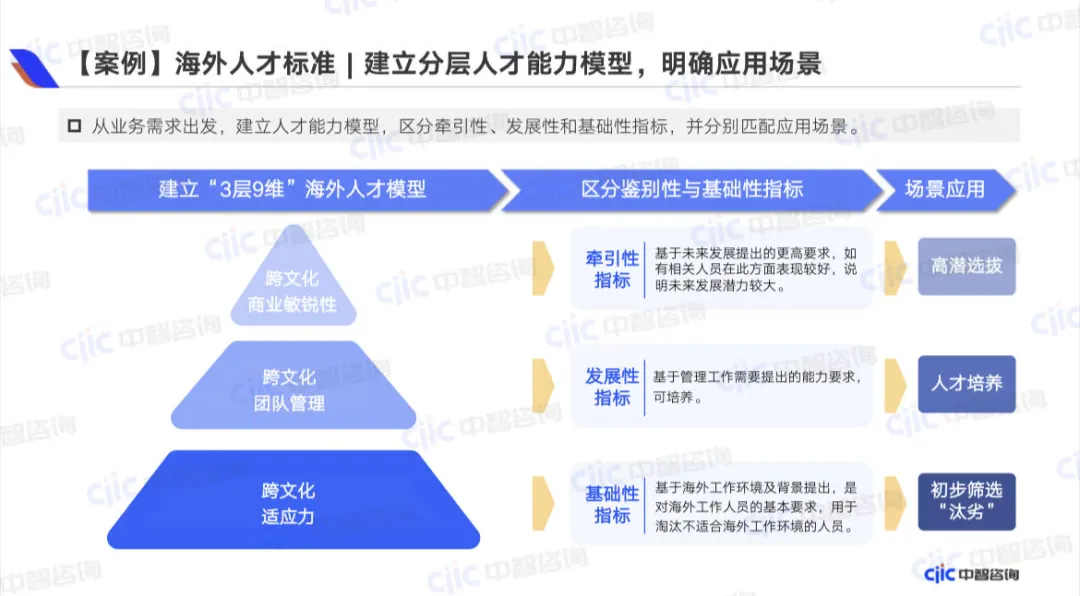 基于海外人才管理需求,A企业建立了“3层9维”海外人才模型,区分“基础性”、“发展性”、“鉴别性”指标,并分别明确应用场景。