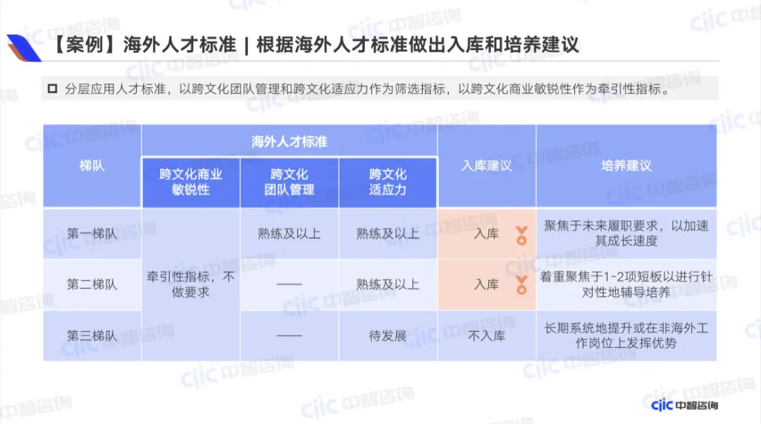 以海外人才标准为牵引,A企业建立并完善了以“跨文化适应力”为入库能力标准,以“跨文化团队管理”为海外人才基本发展框架,以“跨文化商业敏锐性”为高潜海外人才培养目标的管理体系,并区分第一梯队、第二梯队和第三梯队制定相应的培养计划,提升了海外人才管理效能,为企业出海提供了有效支撑。