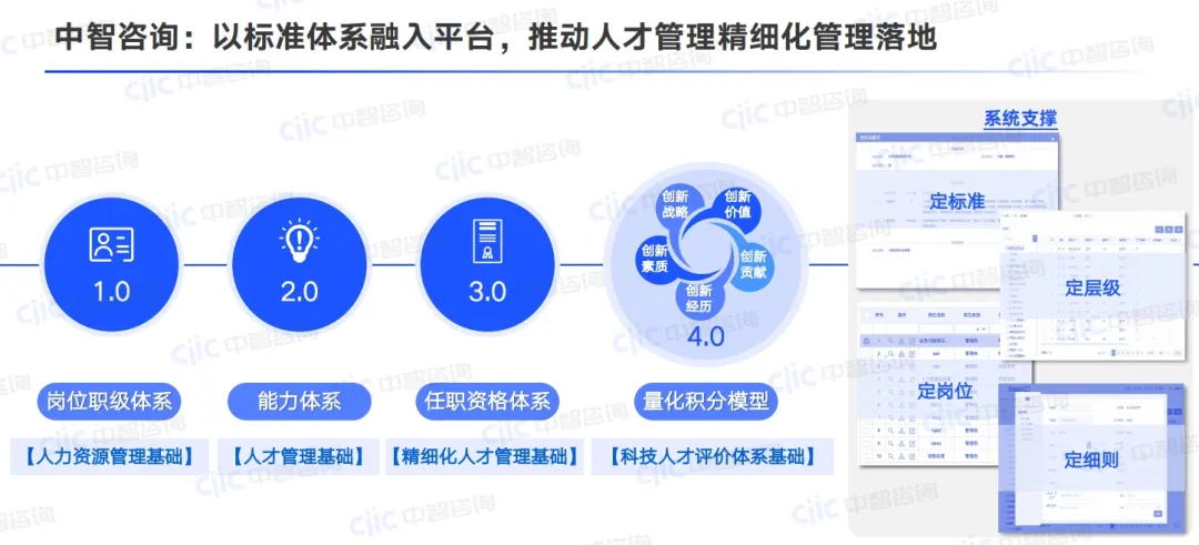 作为标准体系4.0模式,是科技人才评价体系的基础,通过以创新战略、价值、贡献、经历、素质为导向的评价体系,建立科学的积分评价指标和权重体系,通过实现科技人才创新能力的量化积分管理,有利于进一步夯实科技人才精细化管理,靶向推动企业持续创新与发展