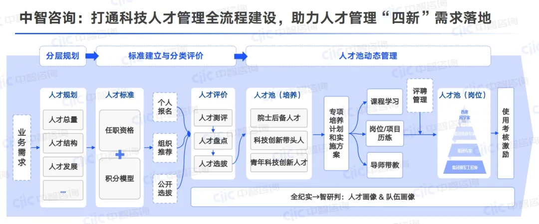 面对人才管理“四新”需求,企业应打通科技人才管理全流程建设,着重抓好科技人才分层规划、标准建立与分类评价、人才池动态管理等关键环节落地,支撑人才管理常态化机制运转。
