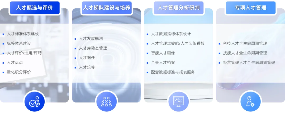 以科学决策、精准管理、效能提升为人才管理数字化建设目标,打通人才“选用育留”全生命周期场景,打通业务体系、夯实数据标准、落地管理场景,打造贯通全场景人才数据管理与应用的数字化平台。