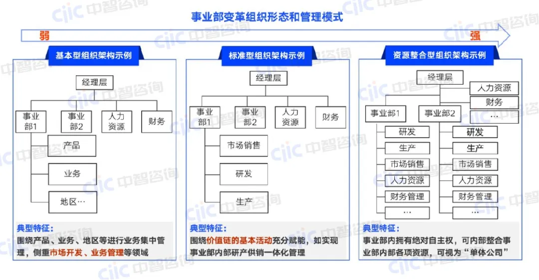 组织是动态的,在企业不同的发展阶段,其组织形态应动态调整优化。面对错综复杂的行业形势,勘察设计企业当下阶段应更加关注第二曲线的打造和提前布局,通过组织变革激发组织活力,同时通过制度流程的规范,强化分类管理,确保基本盘不动摇,整体风险可控。组织变革包括多个方面,包括整体的变革和条线的变革。一方面企业从松散不规范的简单组织,发展为规范集权的功能性组织,到授权协调的事业部型组织,最后形成优化协作的创新部型组织。事业部变革是企业发展到一定阶段裂变的重要选择和举措。另一方面围绕组织变革需要在营销、项目管理、中后台等关键条线重点关注。事业部变革中,应根据整体定位、业务发展阶段、管控授权程度等,选取具体事业部模式。随着管控授权的程度不同,事业部的组织形态也呈现差异化的组织形态和管理模式,根据价值链的不同,中智咨询认为事业部可以分为三种形态:基本型、标准型和资源整合型: