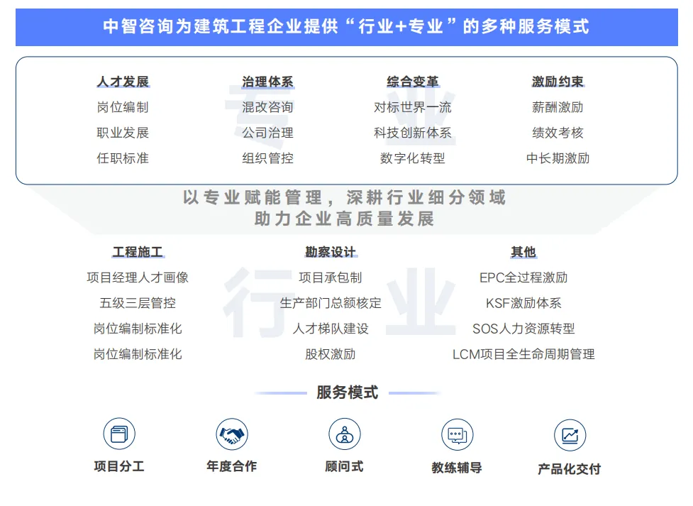 中智咨询基于建筑工程行业人力资源管理和国企改革的专业研究和项目沉淀,提供“行业+专业”的多种服务模式,专注为建筑工程行业企业提供三项制度改革、组织岗位、人才管理、薪酬激励、绩效管理、人力资源数字化等各类咨询项目和顾问服务。