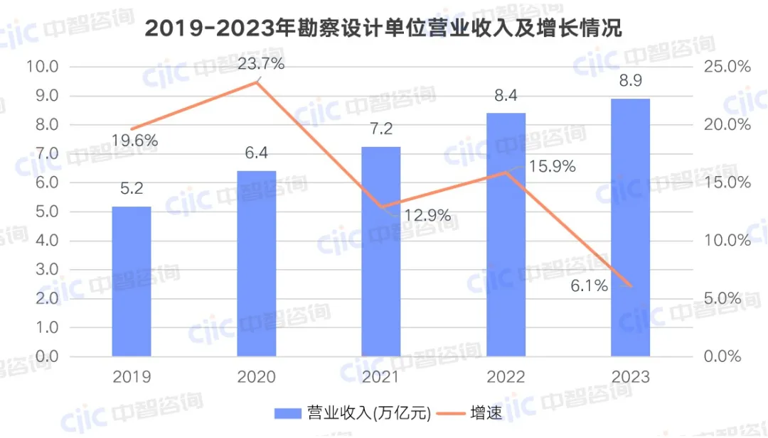 勘察设计等相关行业进入存量竞争时代,勘察设计行业营收持续上升,增速总体呈下行趋势。2019-2023年,勘察设计单位营业收入呈现上升趋势,但增长速度下降,2022年增速降至个位数,为6.1%。