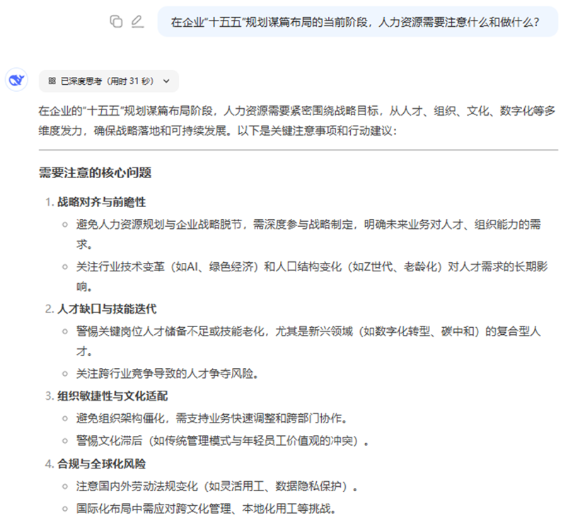 人力资源作为战略规划中的重要内容,在同步谋划时需要注意什么?来看看DeepSeek怎么说: