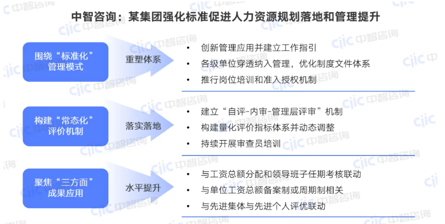 某集团“十四五”期间通过开发人力资源管理体系标准,针对下属单位开展人力资源工作建立了系统完整的工作指引,基本实现能力培训和考核全覆盖,并构建“常态化”评价机制(评价指标包括12个一级指标、29个二级指标、160余项量化检查条款),推动人力资源规划落地落实。