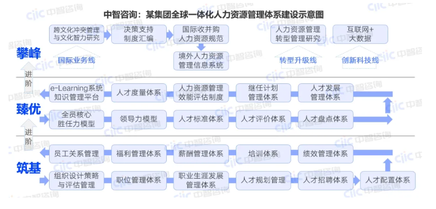 以某集团为例,在国际化战略的总体布局下,为了促进激发人才创新创造活力和持续提升人力资本质量与效能水平,形成了人力资源全球一体化的管理体系。并结合整体国际化进程,在规划落地计划中采取“分阶段、演进式”策略,紧紧围绕现实需要从低至高逐级开展落地实施和持续建设。