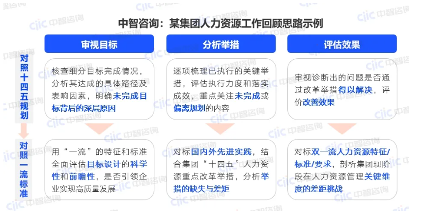 以某集团为例,该企业在对“十四五”人力资源进行常规回顾的基础上,融入“创建世界一流”视角,同时前瞻“十五五”规划重点,以更高站位、更远视野思考人力资源如何支撑企业实现高质量发展。