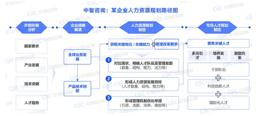 以中智咨询服务的某制造业出海企业为例,该企业围绕战略目标,开展“产业-技术-能力-人才-机制”全链条分析,制定人力资源总体规划及三个专项人才规划。规划全面回应内外部变量、战略任务要求,推动业务发展、技术创新与人才队伍建设协同并进,支撑世界一流企业目标实现。