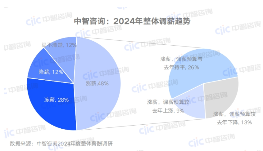调研结果显示,48%的企业在2024年有调薪计划,相比年初调研结果,调薪企业占比下降了9个百分点。