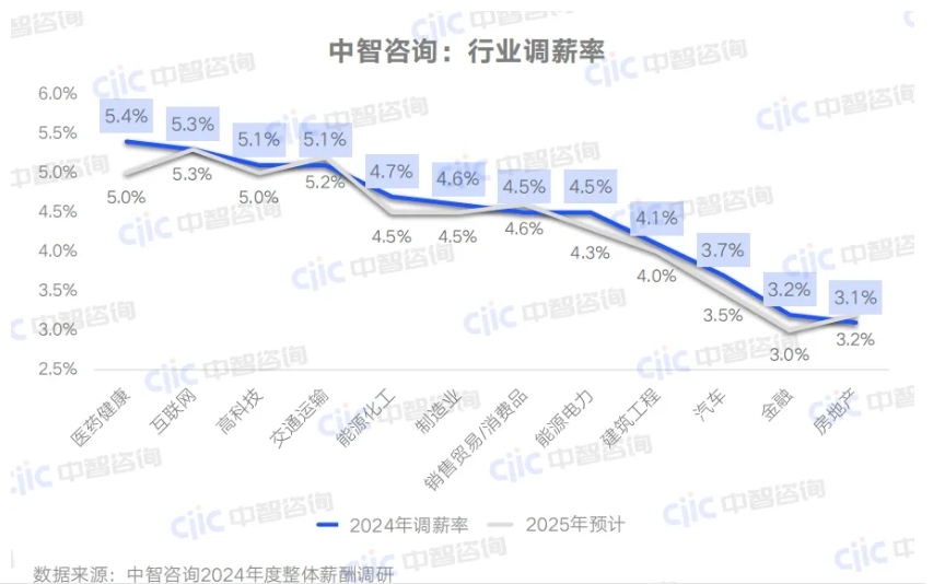 中智咨询2024年整体薪酬调研成果显示:2024年全行业整体调薪率为4.7%。较2023年(5.6%)下降了0.9个百分点,同时低于年初预期调薪水平。其中调研结果显示,预计2025年全行业调薪率调薪率为4.6%。