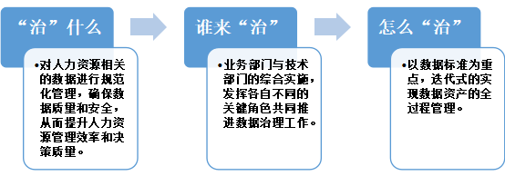 国有企业人力资源数据治理需要明确“治”什么,谁来“治”,怎么“治”,这三个关键维度上的问题,以实现治理项目的顺利推进。
