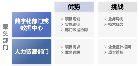 作为业务部门,人力资源部门在数据治理项目中可以负责提出业务需求和数据治理项目的实施目标。由人力资源部门进行项目牵头,能够基于对自身的数据业务场景的全面了解,更好地掌握业务流程和数据治理的实践,使数据治理与业务流程进行深度结合,实现数据治理在业务领域的最佳实践效果。当然,由人力资源部门牵头数据治理项目同样也存在一定挑战,例如业务视角会更局限于部门自身的应用场景,对于集团或企业层面的数据架构缺乏整体性的考虑,同时也会更侧重功能性的落地实现,不容易在实施成本和实施结果中形成最佳的平衡。