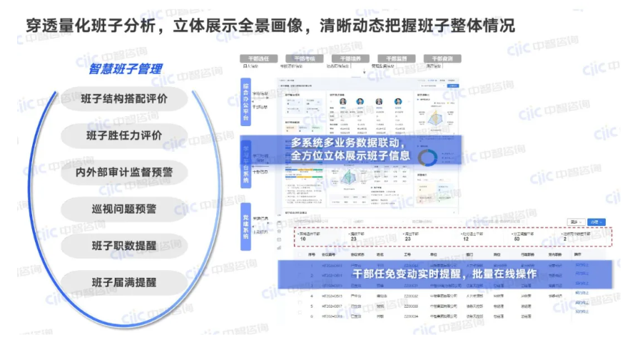 做好配备:智能模拟班子配备,科学组建高能“指挥部”; 做实评价:多元线上班子评价,精准落地考核指挥棒; 绘全画像:立体透视班子画像,清晰把握班子整体情况。