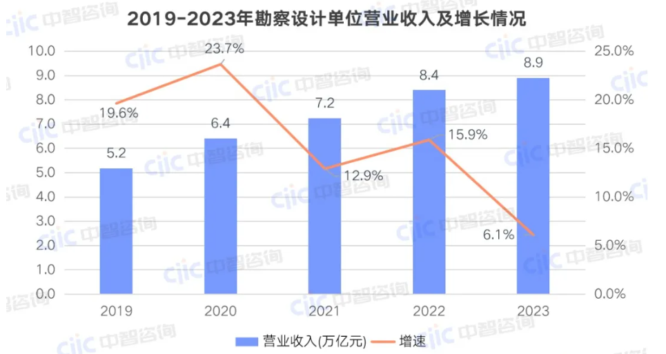 勘察设计等相关行业进入存量竞争时代,勘察设计行业营收持续上升,增速总体呈下行趋势。2019-2023年,勘察设计单位营业收入呈现上升趋势,但增长速度下降,2022年增速降至个位数,为6.1%。