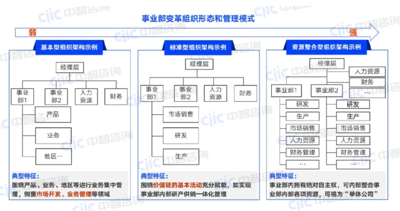 组织是动态的,在企业不同的发展阶段,其组织形态应动态调整优化。面对错综复杂的行业形势,勘察设计企业当下阶段应更加关注第二曲线的打造和提前布局,通过组织变革激发组织活力,同时通过制度流程的规范,强化分类管理,确保基本盘不动摇,整体风险可控。组织变革包括多个方面,包括整体的变革和条线的变革。一方面企业从松散不规范的简单组织,发展为规范集权的功能性组织,到授权协调的事业部型组织,最后形成优化协作的创新部型组织。事业部变革是企业发展到一定阶段裂变的重要选择和举措。另一方面围绕组织变革需要在营销、项目管理、中后台等关键条线重点关注。事业部变革中,应根据整体定位、业务发展阶段、管控授权程度等,选取具体事业部模式。随着管控授权的程度不同,事业部的组织形态也呈现差异化的组织形态和管理模式,根据价值链的不同,中智咨询认为事业部可以分为三种形态:基本型、标准型和资源整合型: