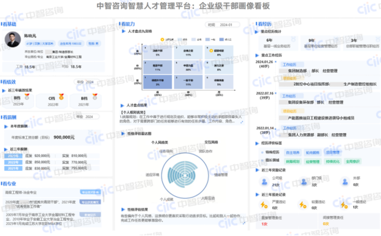 在诊断出核心痛点后,中智咨询为该企业梳理形成了一套集团通用的数据标准并进行了全集团层面贯标,实现了业务数据口径的统一。同时,根据中智咨询“六看”模型沉淀出一套全面的干部分析指标体系,可以从多维度视角全面剖析干部画像,细化分析干部情况。结合智能化看板的应用,通过展示各维度干部信息,为干部评聘与任用提供全面、精准支撑,推动人才工作高质量发展。