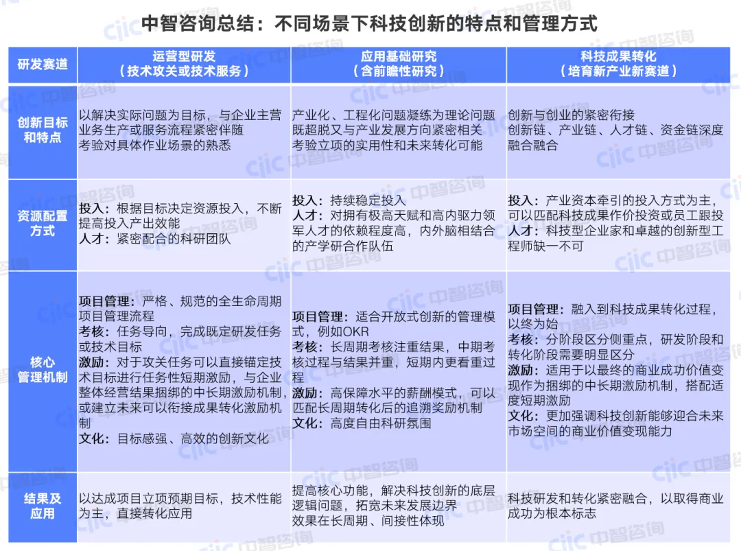 国有企业科技创新体制机制建设第一类是运营型研发,在传统工业类企业中普遍存在,其特点是紧密伴随企业生产或服务过程,是国有企业科技创新的传统形态,大部分企业有比较深厚的经验积累。 第二类是应用基础研究,近年科技体制机制改革的重点方向之一,过去在企业较少布局,但对大型企业的长期技术竞争力有深层次影响。 第三类是以培育新产业新赛道为目标、更需要“四链融合”发展的科技成果转化,可以为国有企业加快形成新质生产力。