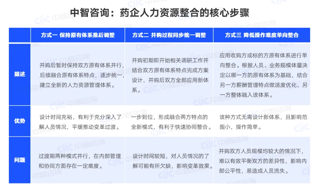 对于医药企业来说,大部分横向并购的目的是购买目标品种、丰富产品类型或快速提升市场占有率,因此人力资源体系的融合是较为适宜的选择,更有利于整合后人力资源体系的统一管理。
