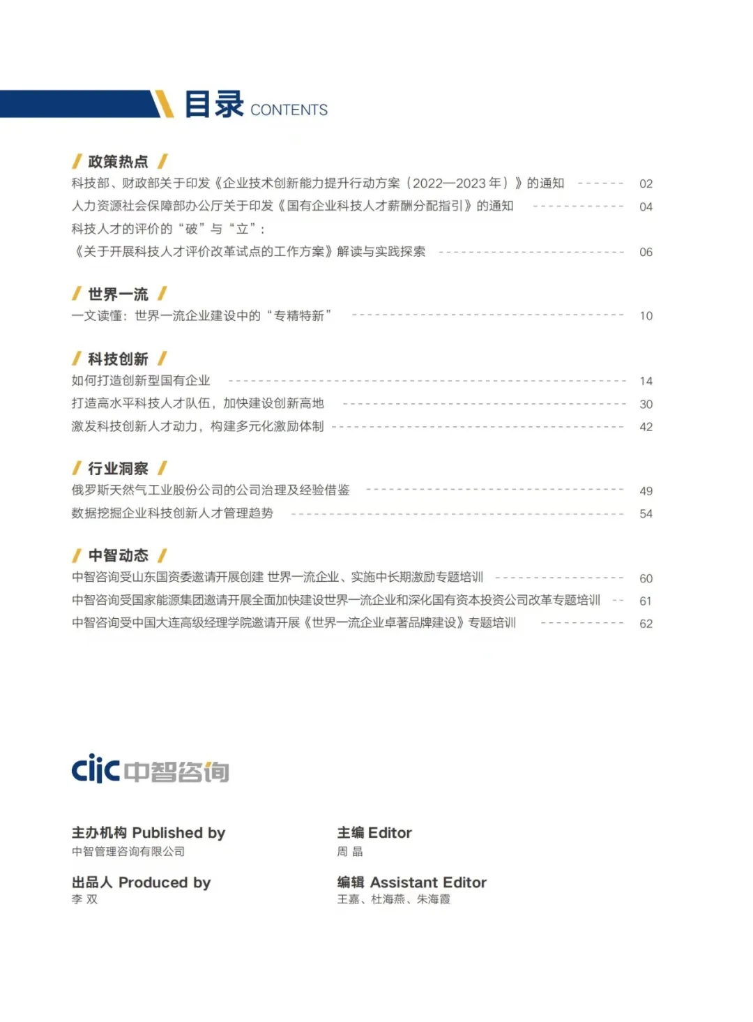为此,中智咨询特别策划本期《强化企业科技创新主体地位 着力打造创新型国有企业》专刊,以国家战略、政策背景为依托,围绕创新型国有企业,聚焦科技创新队伍建设、研发人才培养与激励等主题,探讨国有企业科技创新成长之路的多维度实现策略,以期为国有企业科技创新的提供有价值的参考,促进国有企业自主创新。