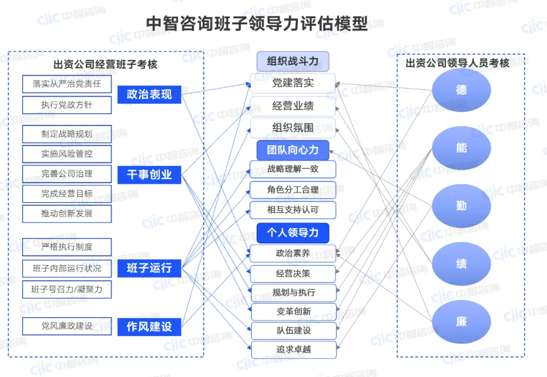 中智咨询的班子领导力评估模型,通过构建“班子-组织-个人”一体化考核逻辑,打通出资公司经营班子考核(政治表现、干事创业等维度)、组织战斗力(党建、业绩、氛围等)、领导人员考核(德能勤绩廉)之间的关联,实现多维度、全链条管理。