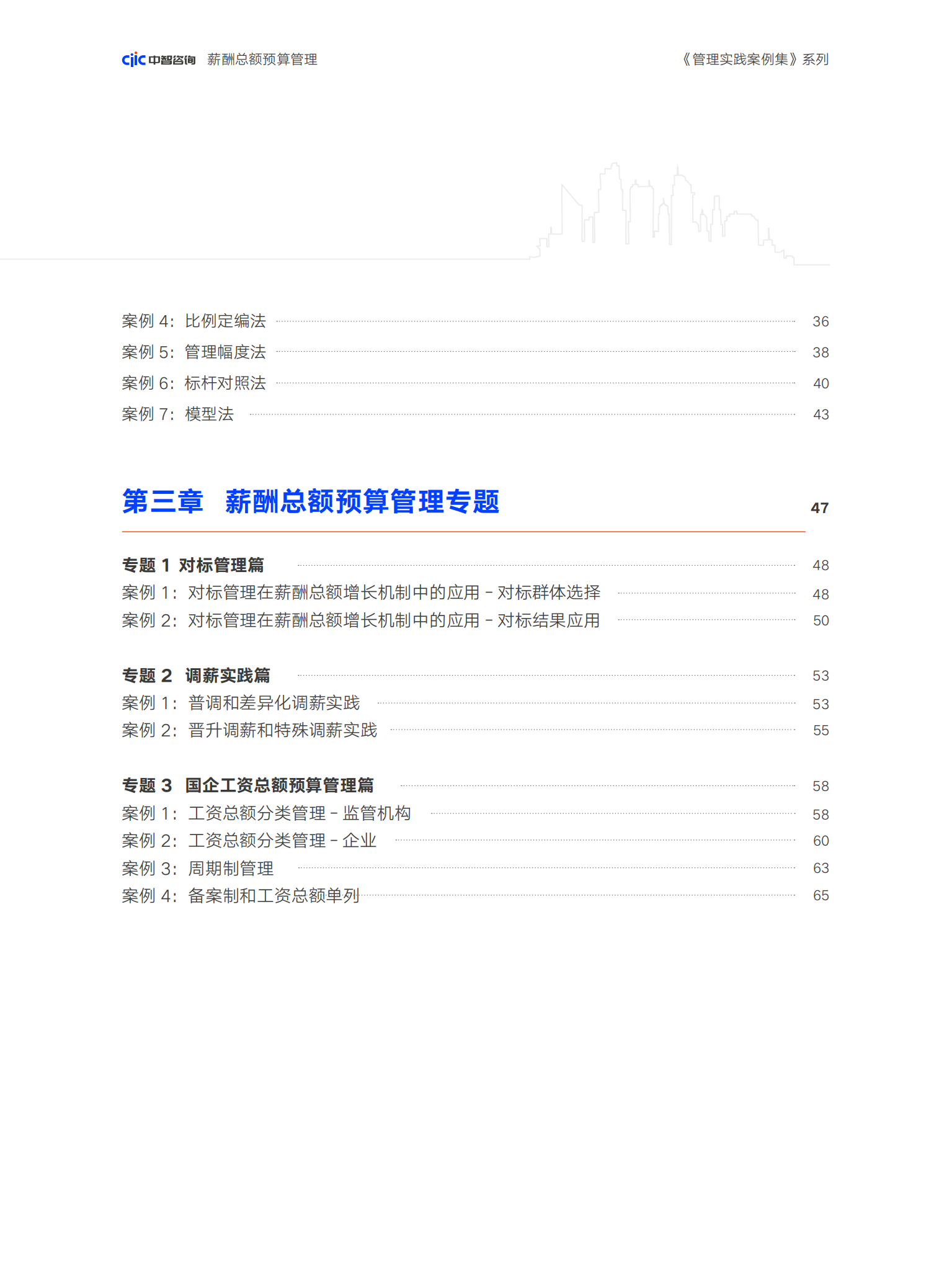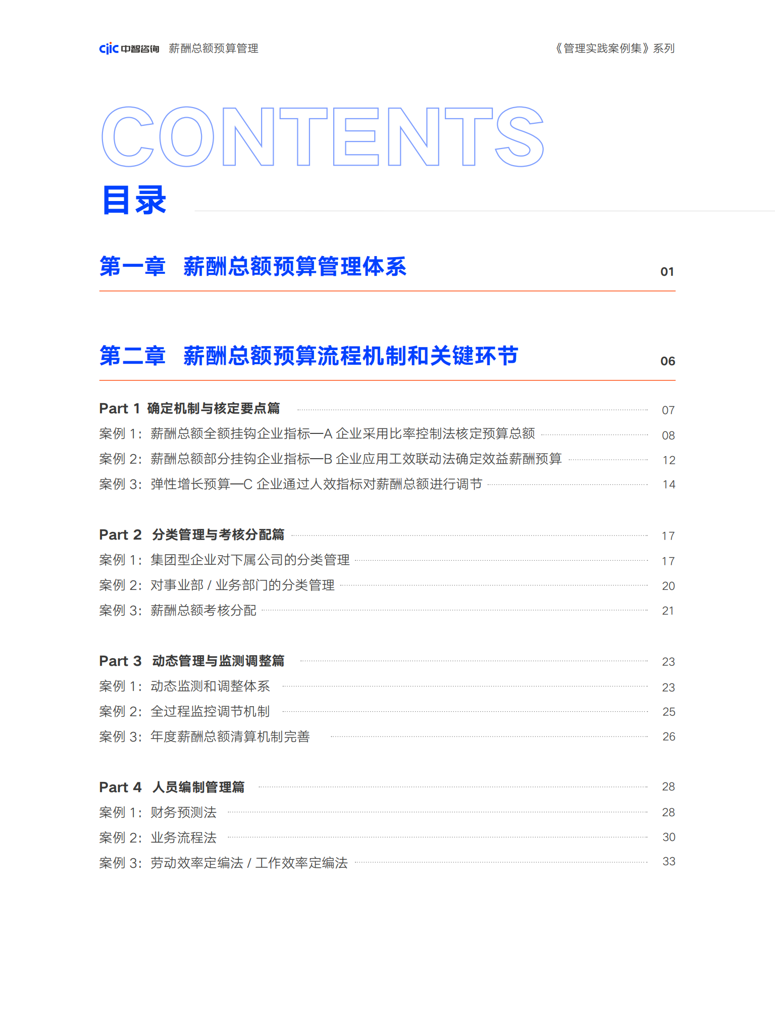 《薪酬总额预算管理实践案例集》将针对薪酬总额预算的流程机制和关键环节,以及对标管理、调薪实践、国有企业薪酬总额预算管理三个专题,汇集七大篇章的标杆企业优秀管理实践案例,每个篇章包含2-4个案例,案例集共涵盖24个案例。