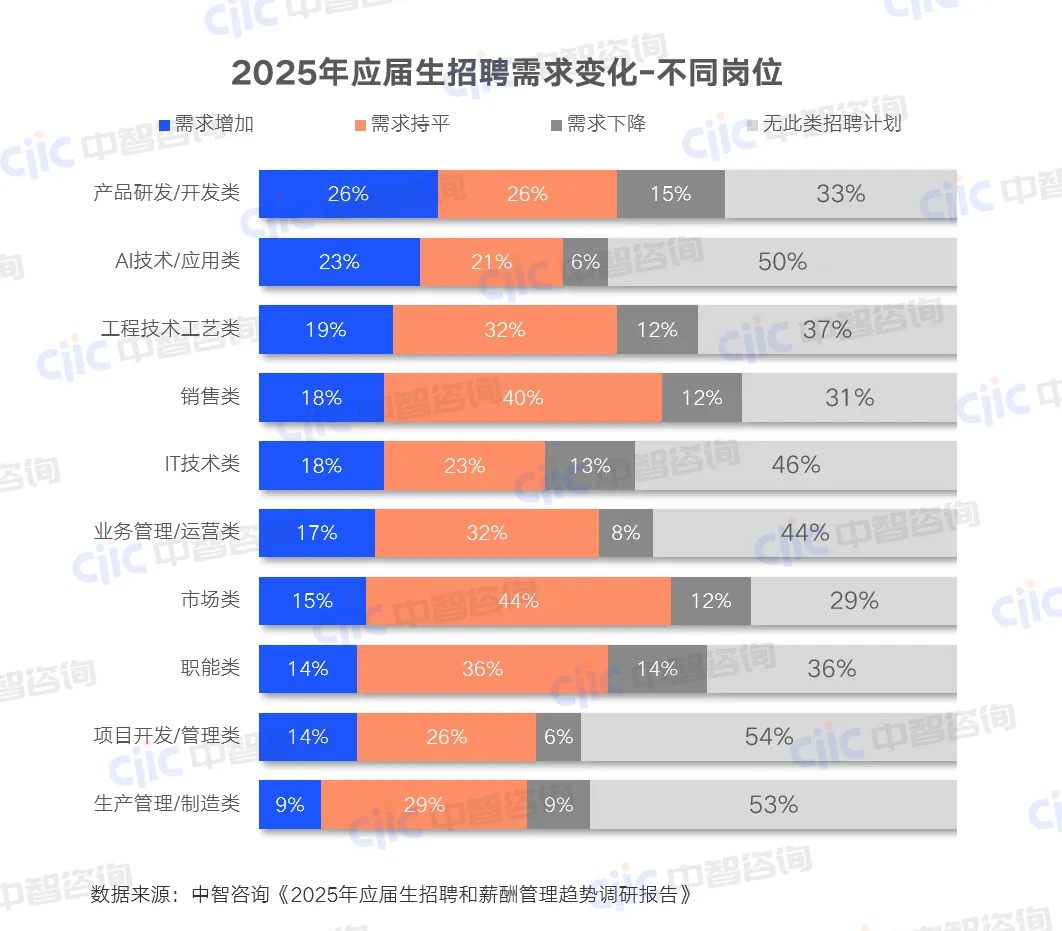 但细分领域亮点十足:AI技术/应用类岗位需求上涨!半数企业有该类岗位校招计划,23%企业需求同比增加,在大模型加速落地背景下,人工智能、算法、大数据等技术岗成“抢人重点”。
