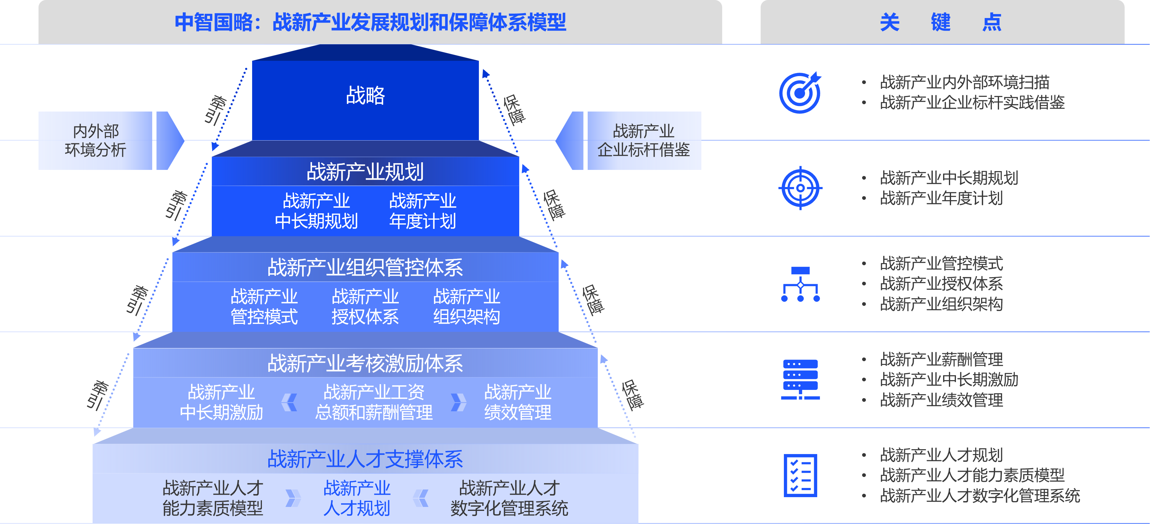 基于公司战略,从产业规划、组织管控、考核激励、人才支撑等方面,构建国企特点的战新产业发展规划和保障体系。